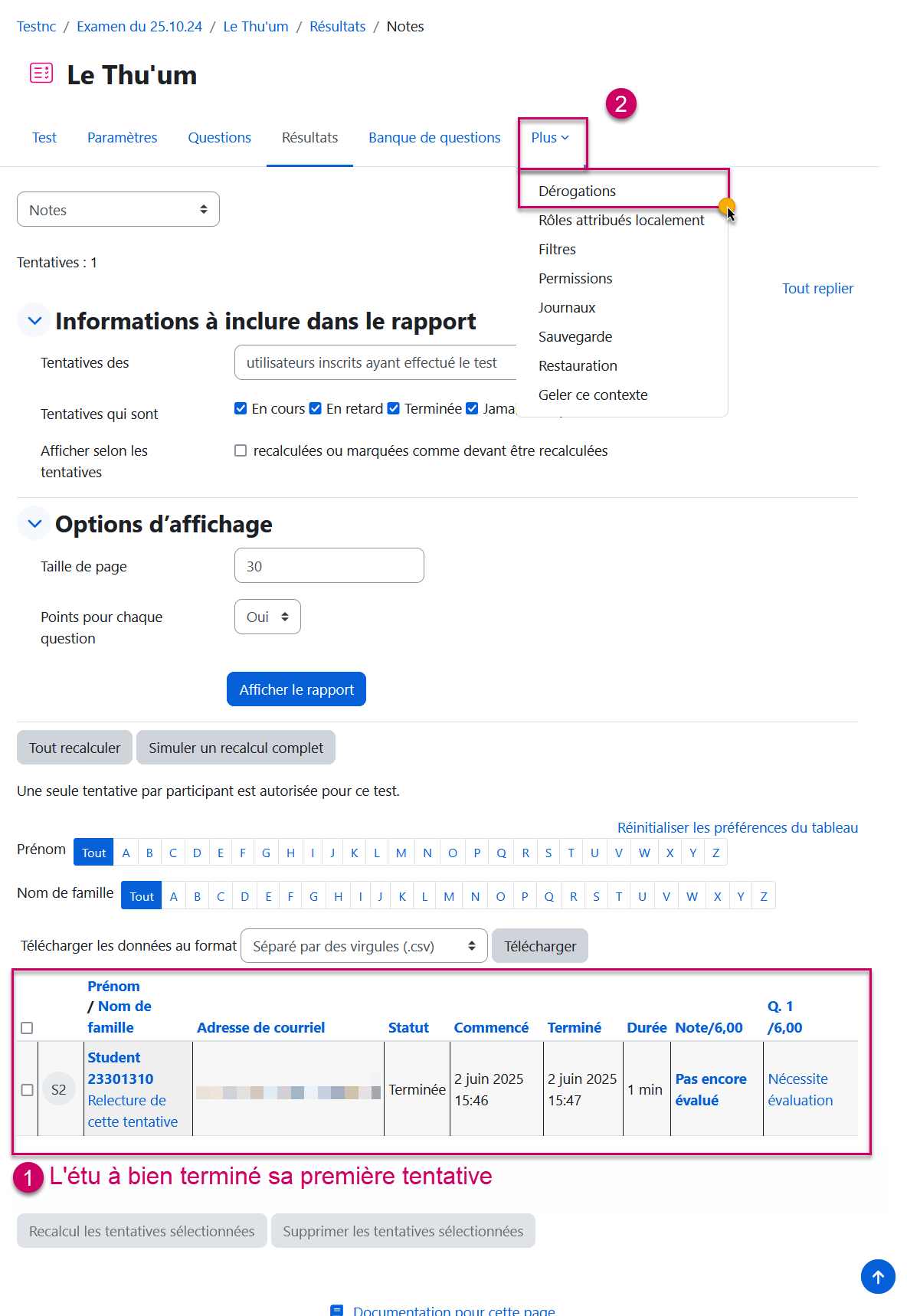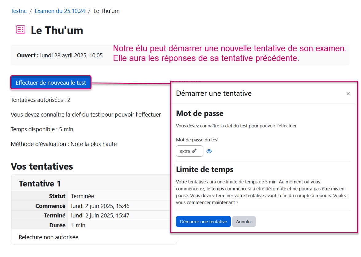 Maintenant que les deux réglages ci-dessus sont fait, l'étudiant peut commencer une nouvelle tentative.