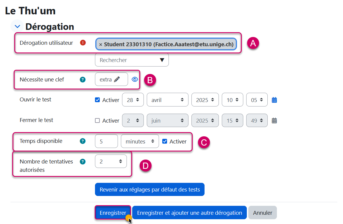 - Créer une dérogation pour cet étudiant avec les réglages suivants :