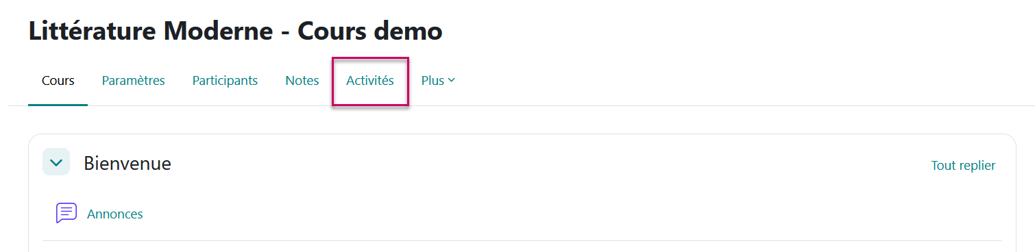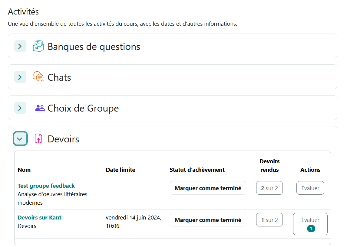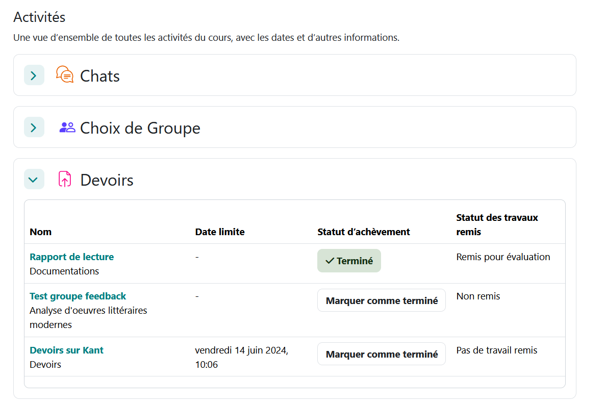 La vue d'ensemble des activités répertorie toutes les activités du cours avec les dates et d'autres informations pertinentes pour les enseignant·es et les étudiant·es.
