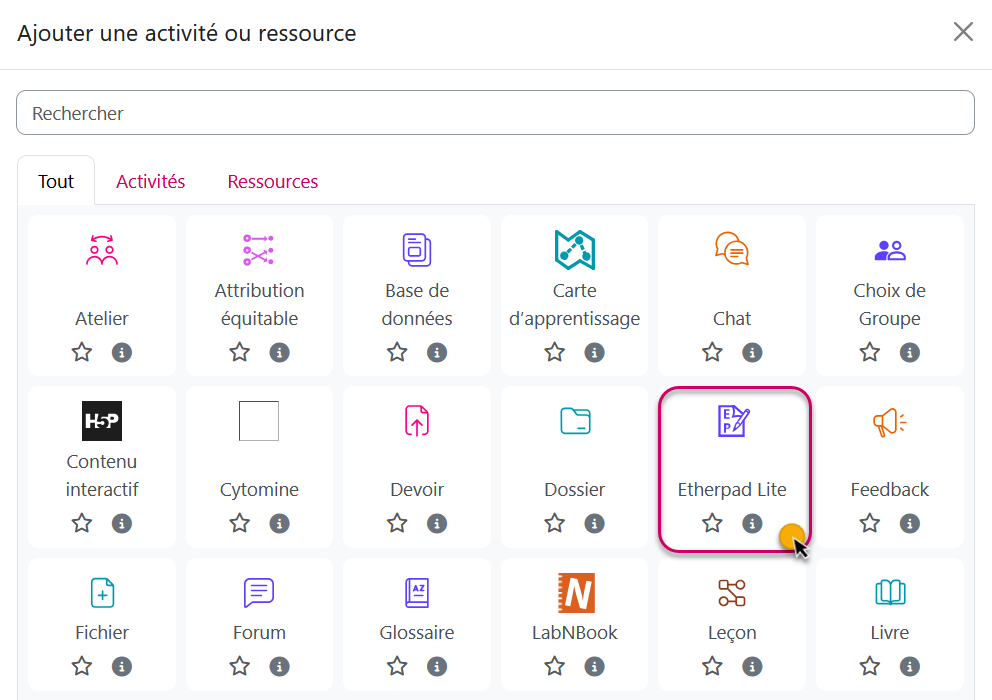 Choisissez Etherpad Lite, qui est le nom de l'activité dans Moodle.