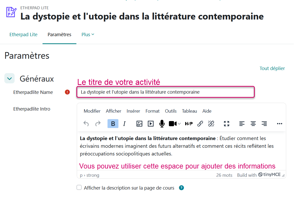 Puis, vous n'avez qu'à lui donner un titre. C'est le seul élément qui est obligatoire pour l'ajout de l'activité dans votre cours.