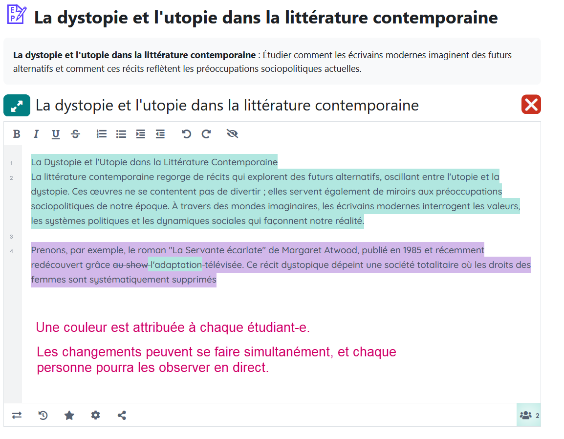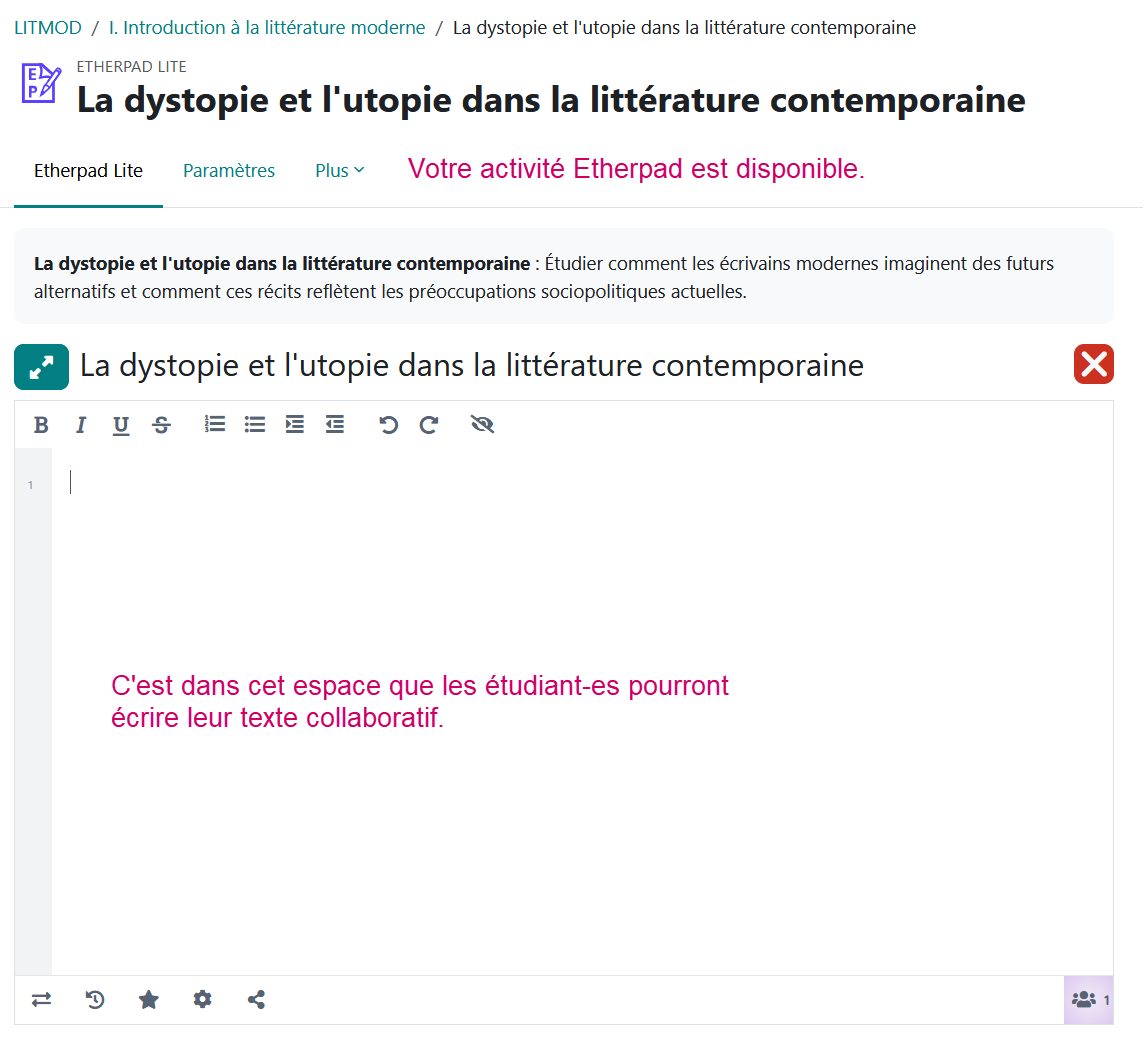 Votre activité Etherpad est maintenant disponible. Vos étudiant-es peuvent maintenant y accéder et commencez à collaborer.