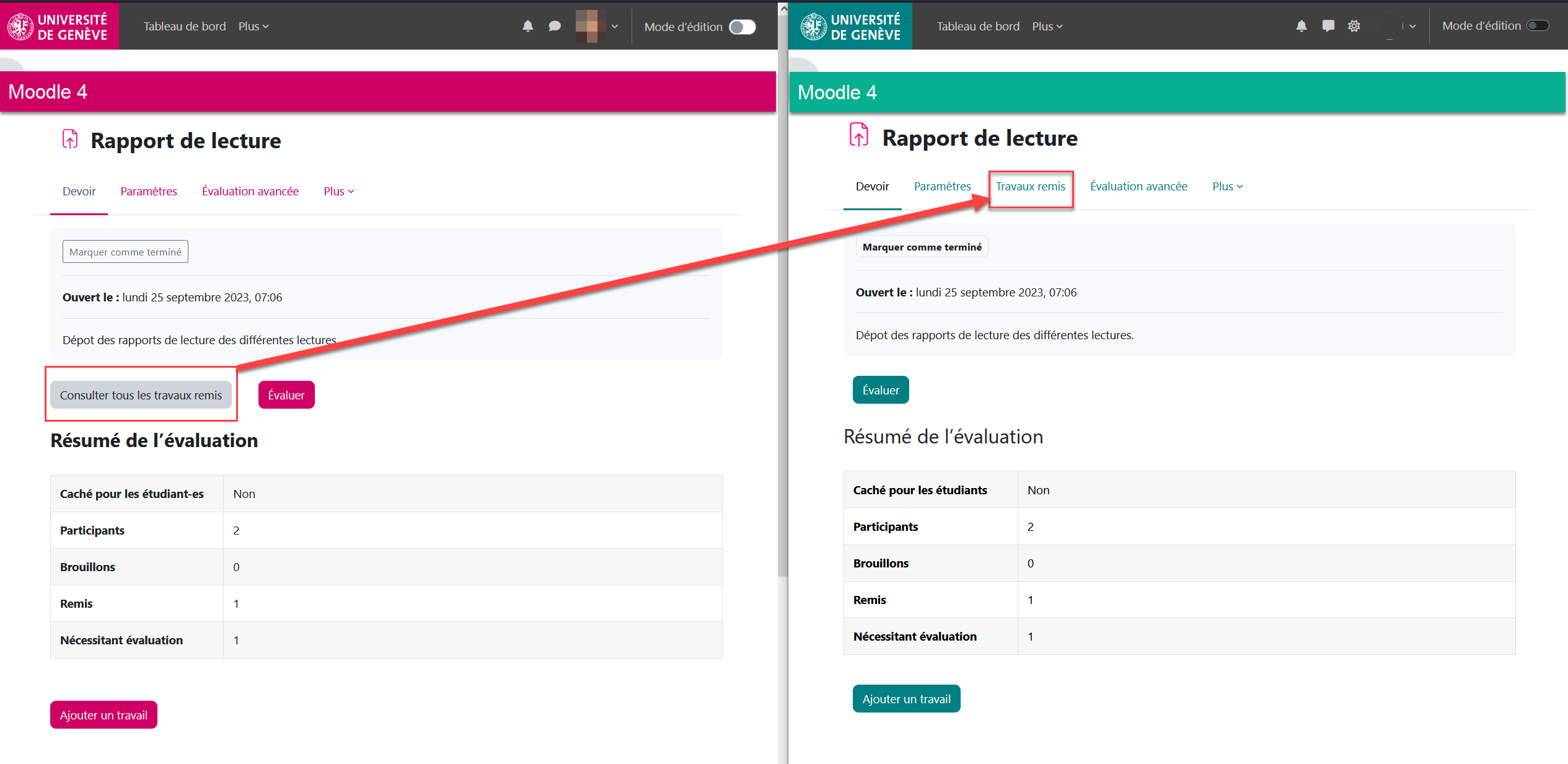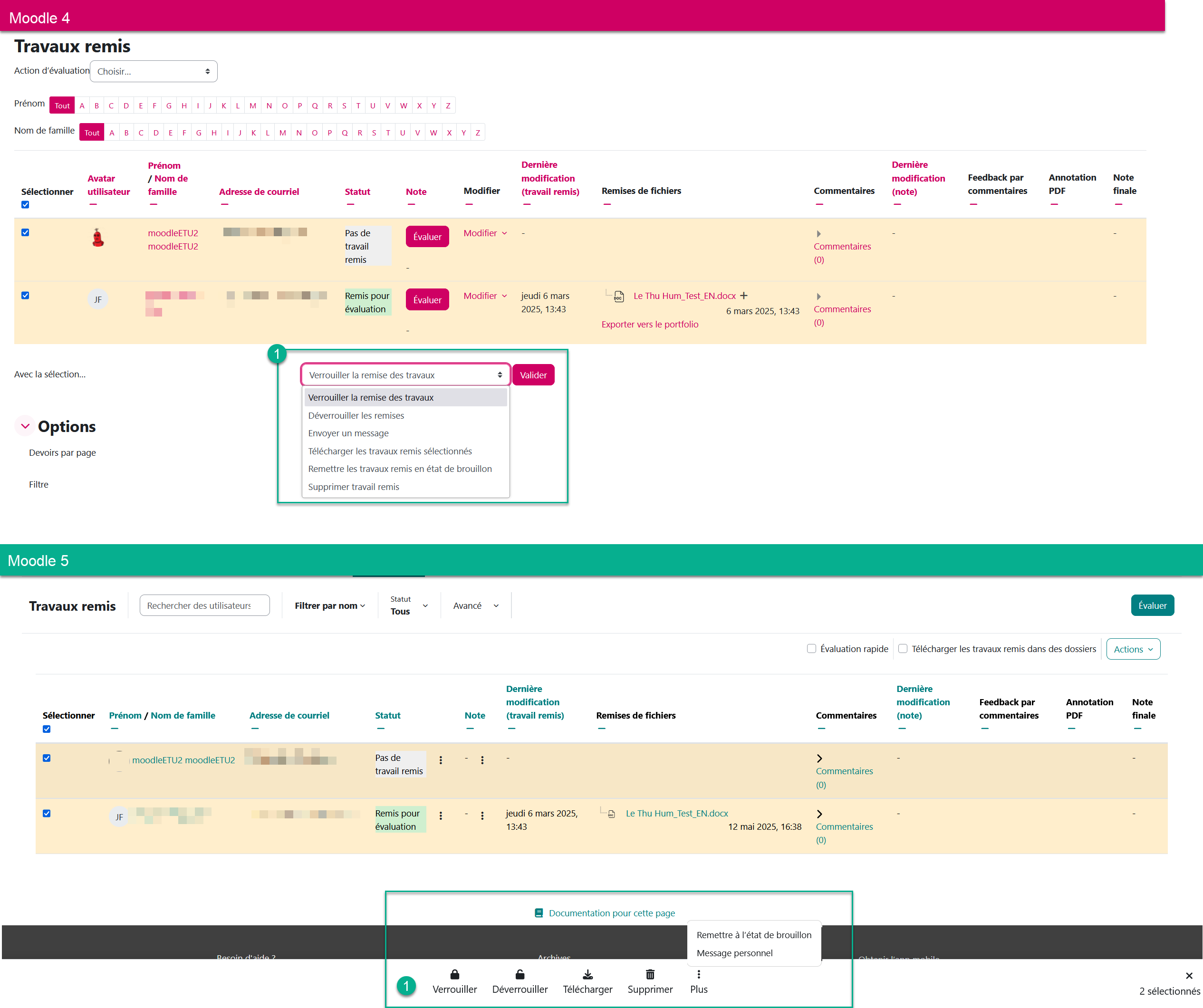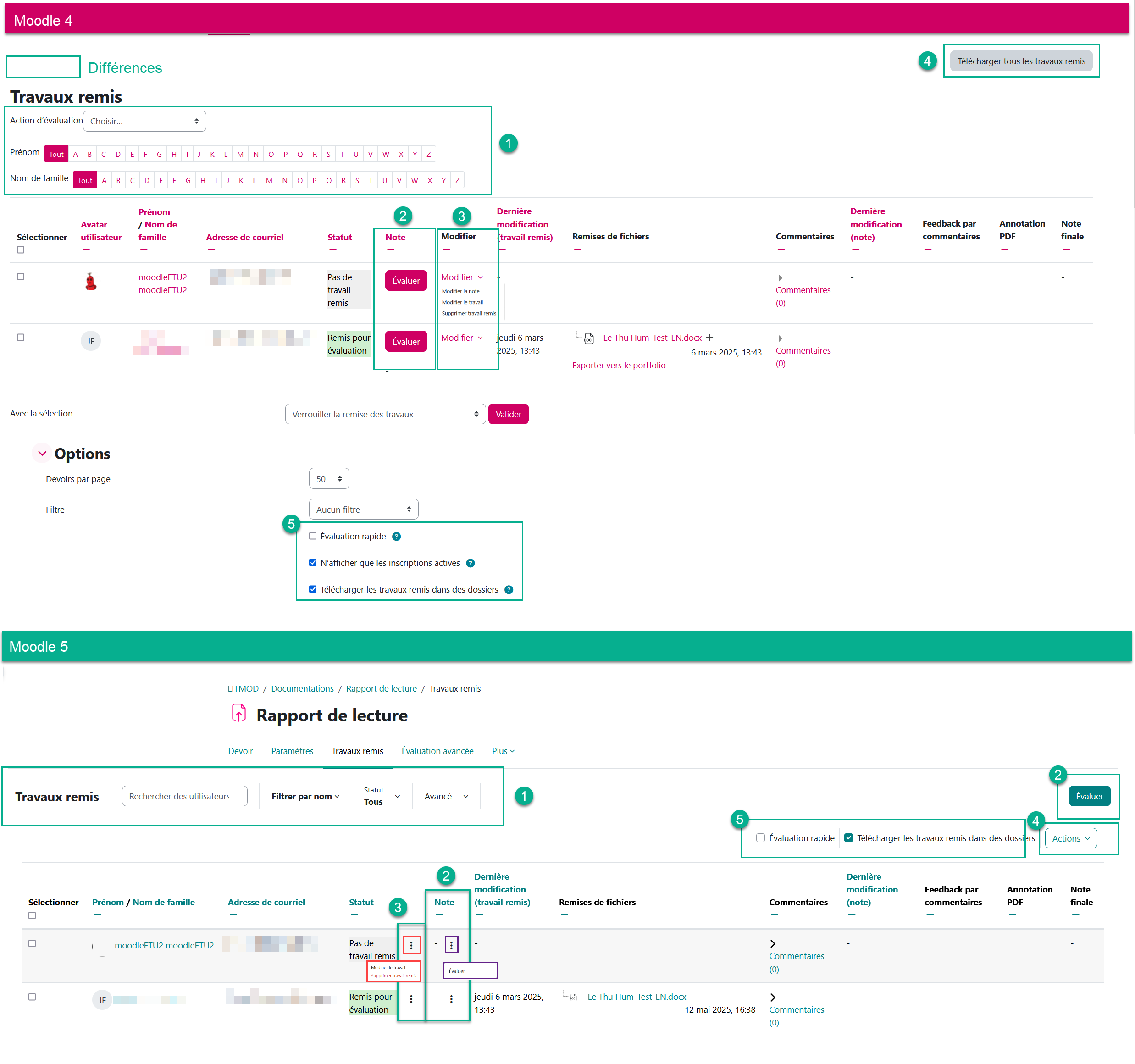 Lorsque vous consulter les travaux remis, les boutons ont été déplacés. Ci dessous vous trouverez un comparatif entre Moodle 4 et Moodle 5.