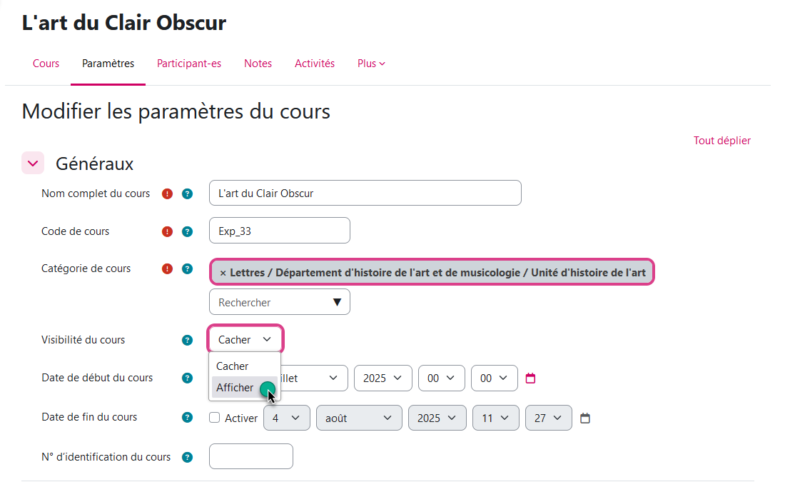 2. Cacher/rendre visible son espace de cours