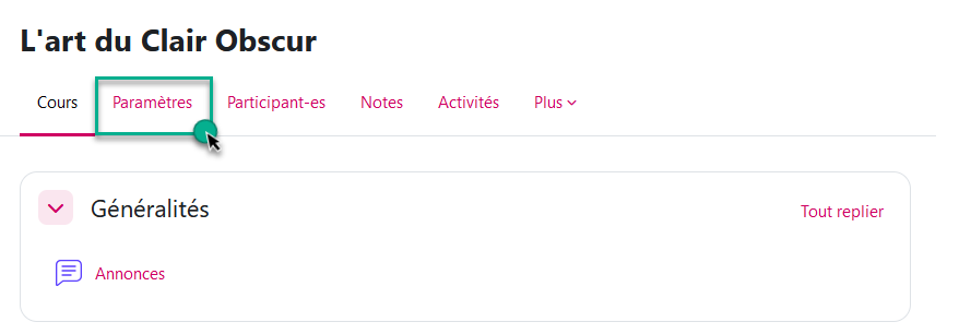 - Cliquez sur "Paramètres" du cours: