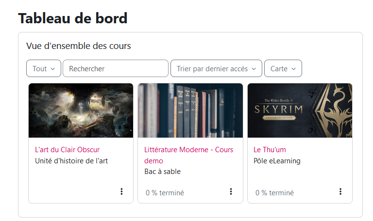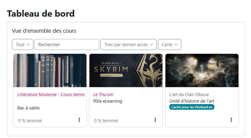Depuis votre tableau de bord, les espaces de cours visibles ont un titre rose, les espaces de cours cachés ont un titre gris. Par exemple, sur cette page, le cours "L'art du Clair Obscur" est caché pour les étudiants.