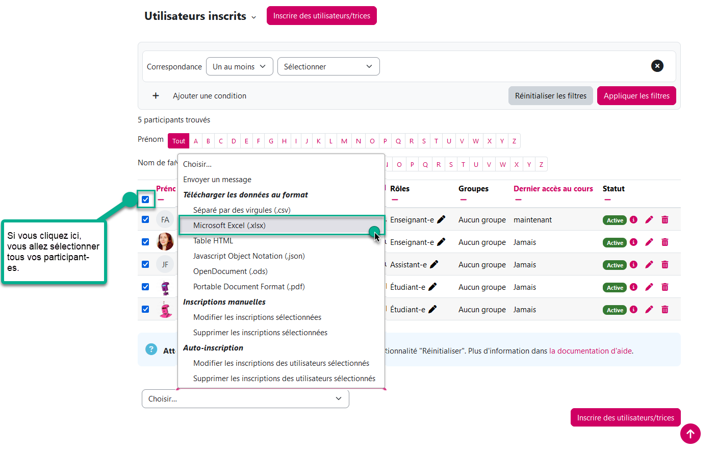2.5 Télécharger la liste des étudiant-es inscrit-es à l'espace de cours