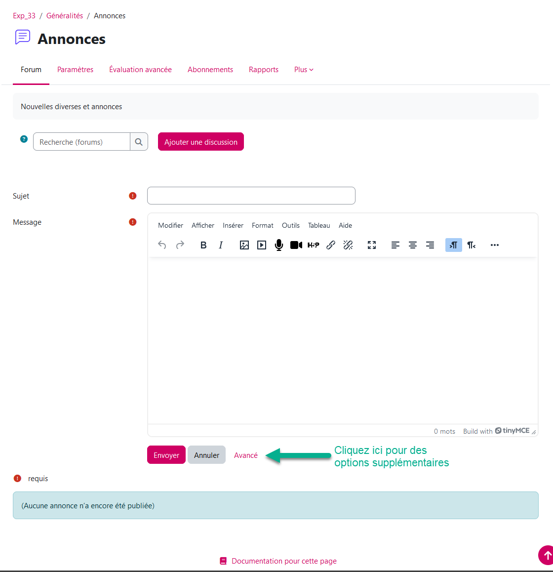 Entrez dans le forum Annonce et cliquez sur "Ajoutez une discussion". Comme pour un e-mail, entrez un titre et le texte du message, notez que vous pouvez ajouter une annexe.