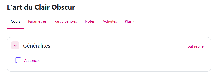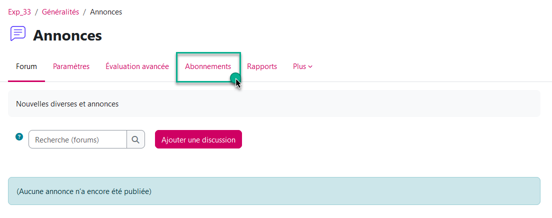 Par défaut, votre espace de cours est ouvert avec un forum intitulé "Annonces" dans le bloc d'introduction.