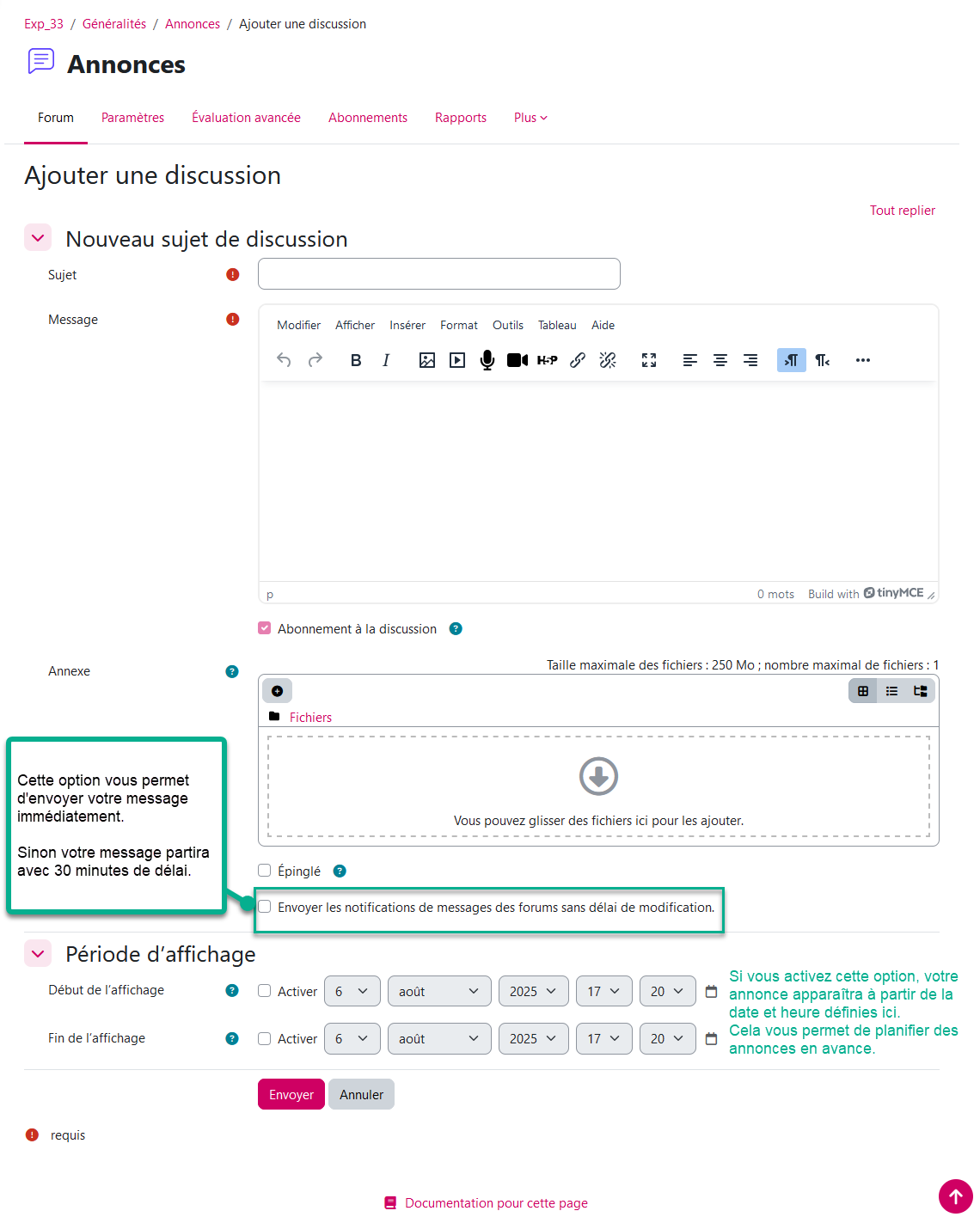 Vous avez aussi des options "Avancé". Si vous cliquez dessus vous ouvrez des options supplémentaires donc une particulièrement intéressante qui est la période d'affichage. Si une date de début est activée, votre annonce ne sera envoyée qu'à partir de la date et de l'heure définie. Cela peut vous permettre de créer en avance vos messages d'annonces et ceux-ci seront envoyer au jour j.  Lorsque vous avez remplis vos champs, cliquer sur le bouton "Envoyer" en bas de page.