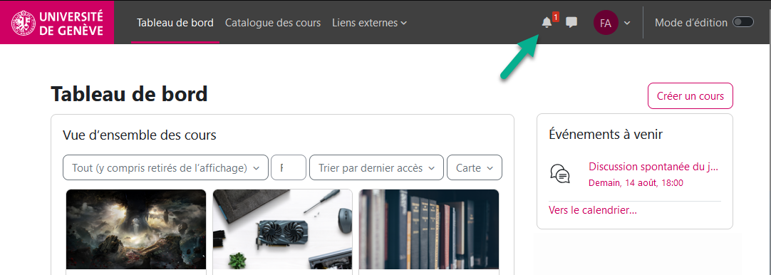 2. l’icône en forme de cloche dans la barre de menu en haut de page indique une alerte (le chiffre correspond aux nombres d'événements récents) :