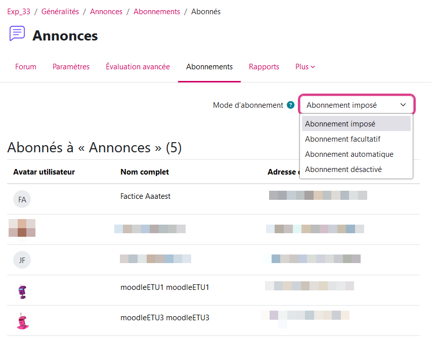 Toute personne inscrite à l'espace de cours (sauf statut gestionnaire) reçoit l'annonce. Vous pouvez voir à tout moment qui est abonné au forum Annonces (comme aux autres forums) :