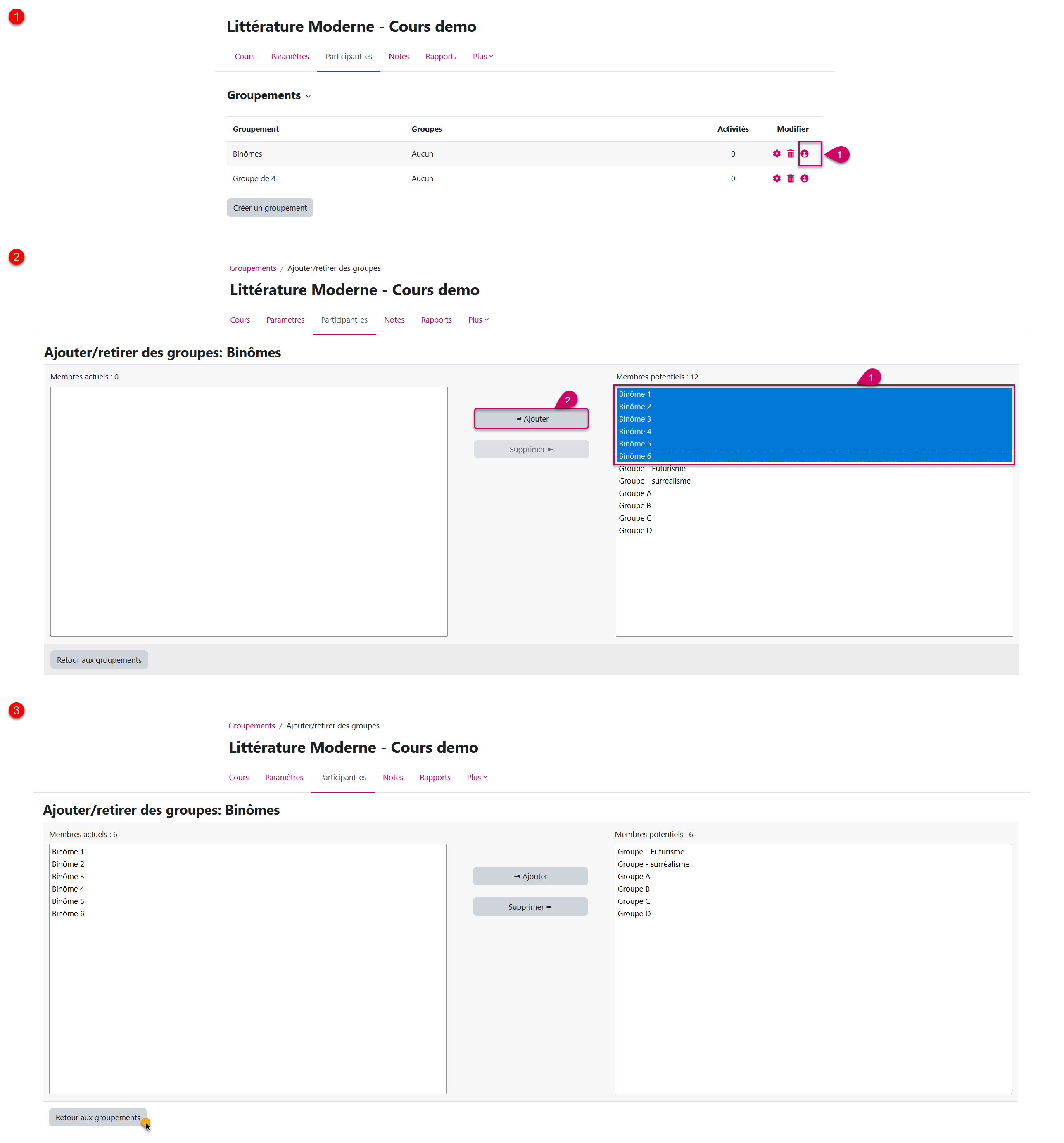 Sélectionnez les groupes et cliquez sur "Ajouter". Faites de même pour chaque groupement: