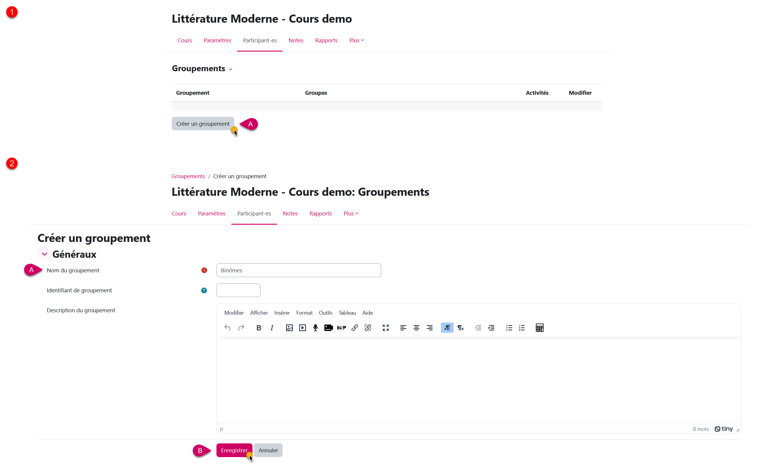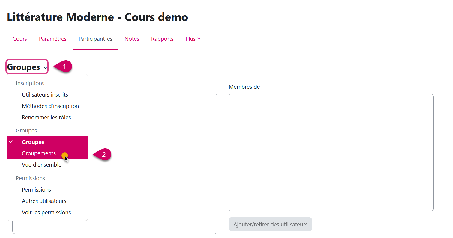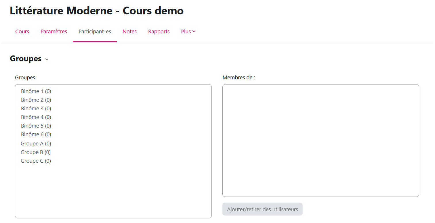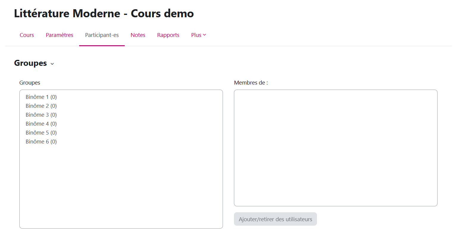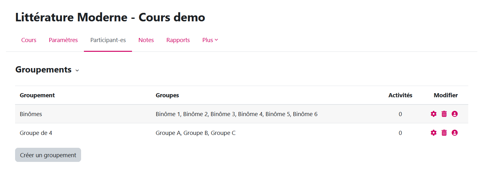 Chaque étudiant·e sera donc inscrit·e dans 2 groupes (un binôme et un groupe de 4). Il faut donc indiquer à Moodle si l'activité (par exemple le devoir à rendre) est liée aux binômes ou aux groupes. Pour cela on crée des "groupements".