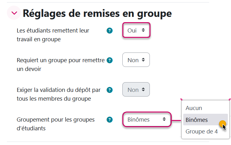 Dans les paramètres du devoir, allez dans les "réglages de remise en groupe":