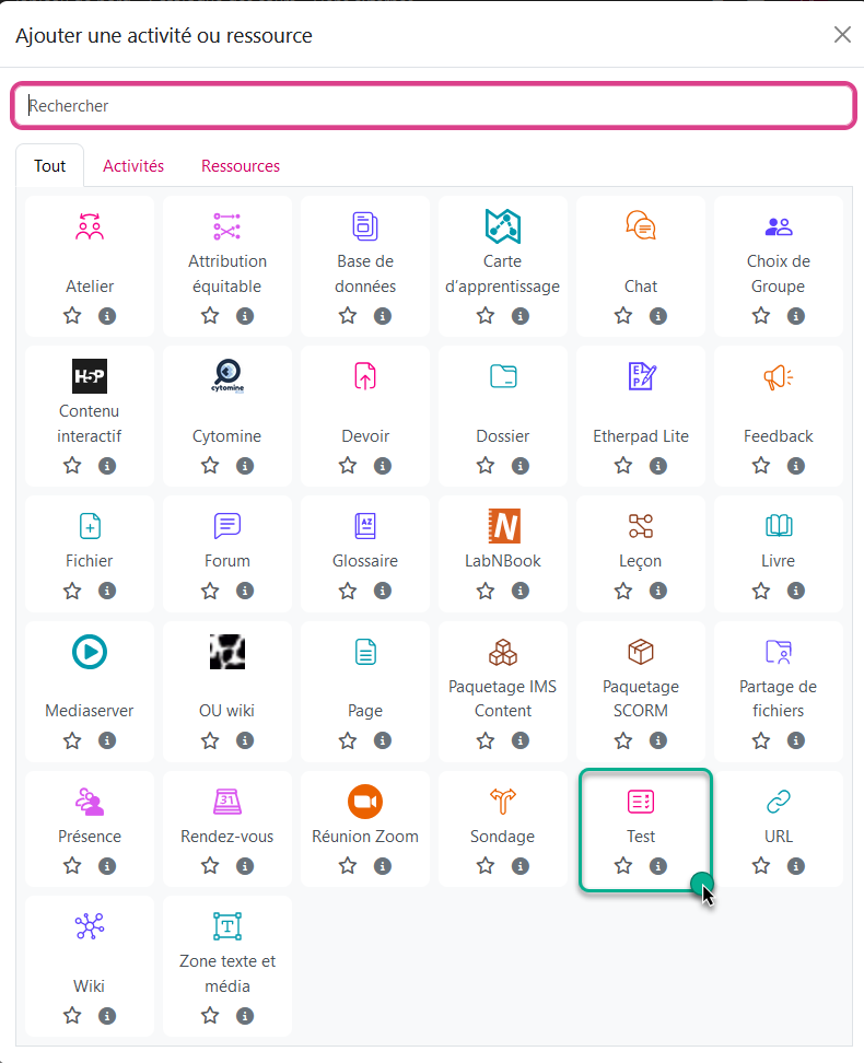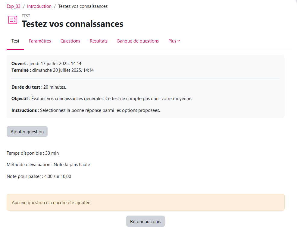 Les derniers paramètres sont standards, vous pouvez les laisser comme tels. Enregistrez, la structure du test est créé. il faut à présent s'occuper du second élément que sont les questions : Pour cela, veuillez consulter la page suivante.