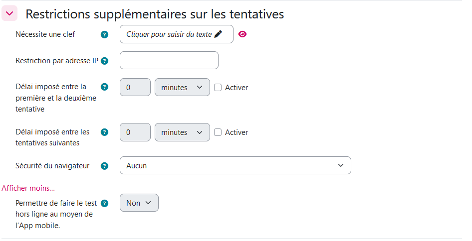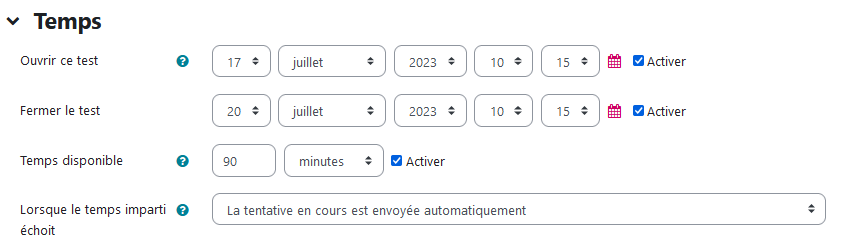 Vous pouvez encadrer le temps pendant lequel il est possible de faire le test: une heure d'ouverture et/ou de fermeture du test. Si vous donnez un temps disponible, cela lancera un compte à rebours du temps dont on dispose pour répondre au test.
