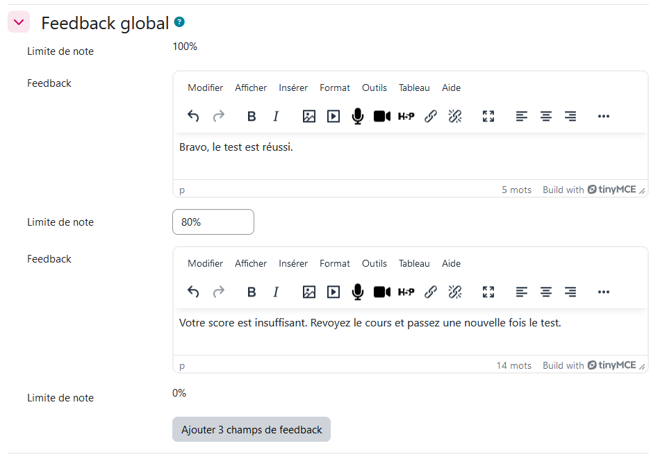 Vous pouvez donner un feedback global en fonction du score obtenu. Vous pouvez avoir un feedback unique ou plusieurs selon les échelles de notes. Par exemple si la note est sur 10 et qu'il faut avoir au moins 8 pour réussir le test, paramétrez de la façon suivante :