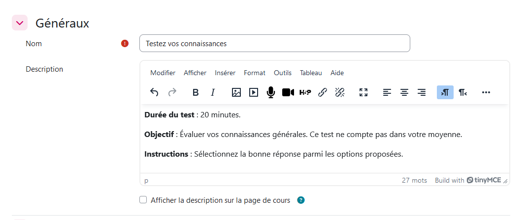 Le champ "Nom" (c'est à dire le titre) est le seul obligatoire, tous les paramètres définis ci-dessous sont facultatifs. Notez que vous pouvez également rédiger une description du test pour donner des consignes.