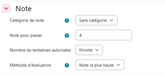 Le résultat d'un test est systématiquement un score. Vous pouvez déterminer la Note pour passer à partir de laquelle vous considérez que le test est réussi. Le Nombre de tentatives autorisées (c'est-à-dire le nombre de fois où on peut recommencer le test) est important et va dépendre de la façon dont vous voulez utiliser le test: si c'est un test en auto-formation pour s'entraîner, vous pouvez laisser un nombre illimité, s'il s'agit d'une évaluation, le test ne peut être passé qu'une fois, etc. Si vous permettez plusieurs tentatives, choisissez la Méthode d'évaluation la plus appropriée (par défaut ce sera la note la plus haute obtenue).