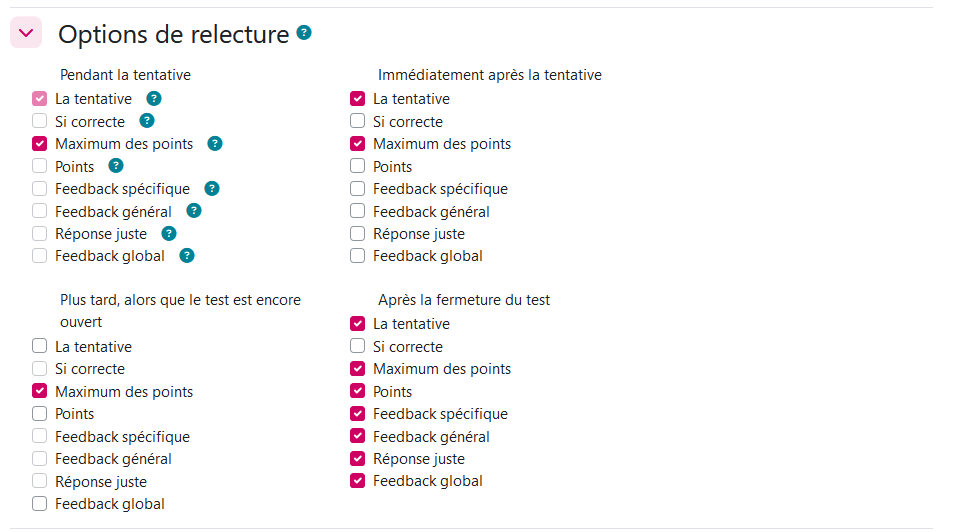 Cette partie est très importante. Il s'agit de ce que verront les étudiant-es après avoir répondu au test. En fonction de votre utilisation du test (auto-évaluation, évaluation sommative, etc.) le paramétrage sera très différent. Tout d'abord notez qu'il y a 4 blocs correspondant à 4 moments: