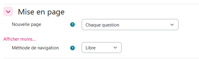 Par défaut, le test affiche une nouvelle page à chaque. Vous pouvez choisir de toutes les afficher sur la même page ou de les regrouper si certaines doivent aller ensemble (nous verrons cela dans l'étape suivante). Notez également que par défaut la navigation dans les questions est libre (on peut commencer par celle qu'on souhaite). Si votre test l'exige, vous pouvez changer pour une navigation séquentielle qui imposera de répondre aux questions dans l'ordre où elles s'affichent.